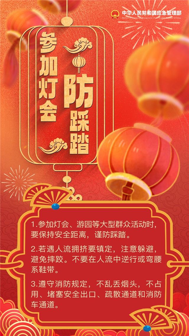 事故案例 2004年2月5日(元宵节)晚7时30分左右,在北京密云密虹公园举办的第二届密云迎春灯展上,密云公园地区游人骤增到3万至4万人,公园内观灯游人达到4000-5000人。因潮白河西岸的居民区内有人燃放烟花,群众中也有正月十五要放礼花的传言,不少游人误认为是在放礼花,因此河东岸的大量游人拥上彩虹桥,导致彩虹桥上拥挤、踩踏,造成37人死亡、多人受伤的特大伤亡事故。 2022年2月16日(正月十六)5时57分,河南省许昌市长葛市新华路一居民家楼发生火灾,1名老人被困,截至6时13分现场明火被消防救援人员全部扑灭。经检查,老人身体并无大碍,火灾造成房间内部分家具和物品损毁。经初步了解,是由于户主在祭祖后未将蜡烛熄灭而引发的火灾。 ↓↓↓ 来源:应急管理部 扫码关注我们 ✦